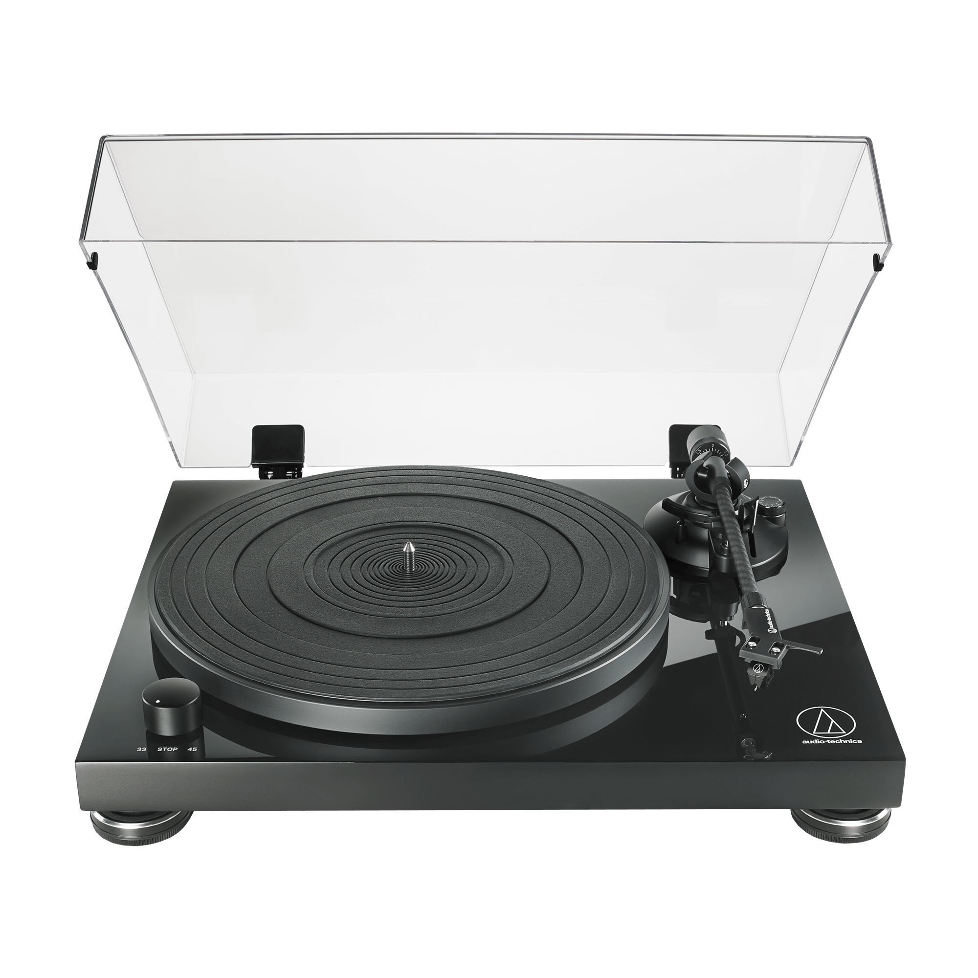 A teljesen manuális, szíjhajtású AT-LPW50PB lemezjátszóval optimális hi-fi minőségben szólnak a lemezei. A 30 mm vastag, rezgésmentes, közepes sűrűségű farostlemezből készült (MDF) magasfényű, zongorafekete alapzat tompítja az alacsony hullámhosszú akusztikus visszacsatolást, a motort pedig érzékelő kíséri figyelemmel, biztosítva a tányér pontosan 33-1/3 és 45 fordulat/perc forgási sebességét. A lemezjátszó egyenes, matt kialakítású szénszálas hangkarján a tűnyomás állítható, az AT-HS4 univerzális, ½” méretű fejrész pedig fekete AT-VM95E Dual (eliptikus) MM hangszedőt tartalmaz.